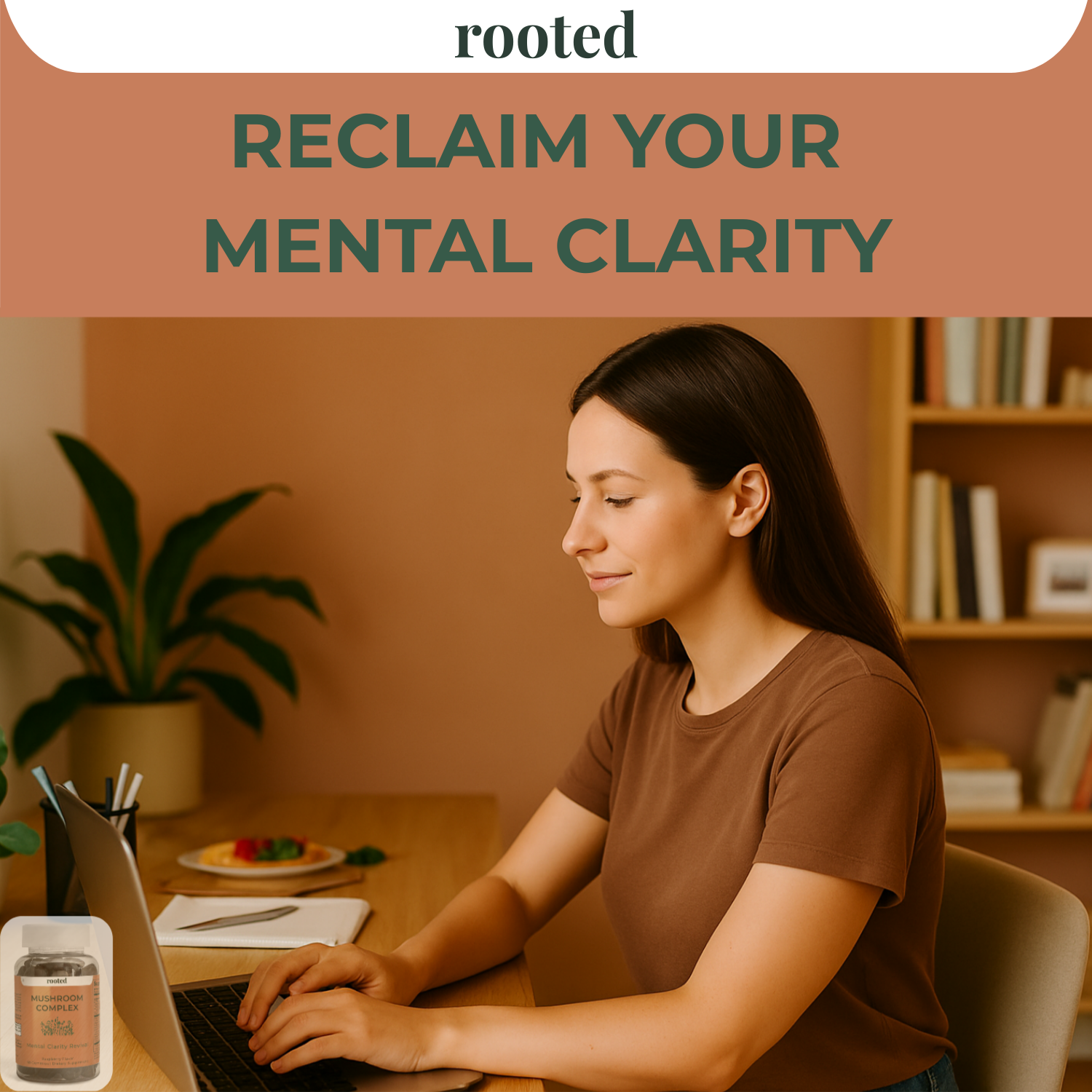 Brain fog lingers from morning to night— Rooted Mushrooms Complex help sharpen focus and restore lasting energy.